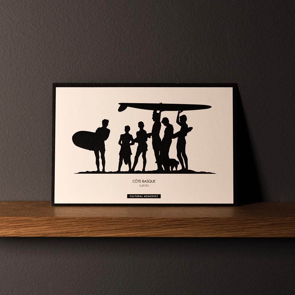 Souvenir Postcard of “Surfers” (group of surfers) silhouette printed on 300gr canvas colored paper, size 100 x 150 mm. French version of the explicative text for the silhouette can be found on the backside.