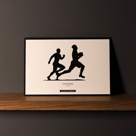 Postal souvenir con silueta “Rugby” (jugadores de rugby) en papel de 300gr color crudo, tamaño 100 x 150 mm. Texto explicativo de la silueta en la parte trasera en Francés.