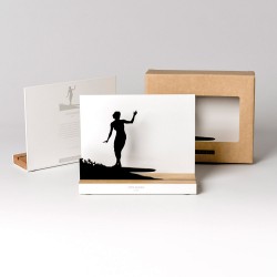 Figura souvenir con estructura de acero lacado en blanco, base de madera de roble y silueta con el motivo "Surf cross step" recortado a láser sobre metacrilato negro brillo de 3 mm de espesor.