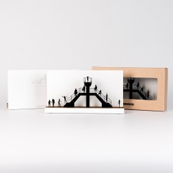 Figura souvenir con estructura de acero lacado en blanco, base de madera de roble y silueta con el motivo del trampolín con bañistas de la piscina de la playa de Bon-Secours en Saint-Malo recortado a láser sobre metacrilato negro brillo de 3 mm de espesor.