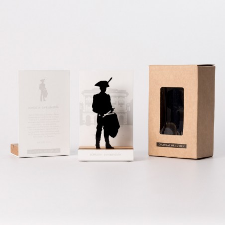 Figura souvenir con estructura de acero lacado en blanco grabada en láser, base de madera de roble y silueta con el motivo “Tamborrero” (personaje de la Tamborrada de San Sebastián) recortado a láser sobre metacrilato negro brillo de 3 mm de espesor.
