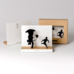 Figura souvenir con estructura de acero lacado en blanco, base de madera de roble y silueta con el motivo Kiliki Caravinagre - niño recortado a láser sobre metacrilato negro brillo de 3 mm de espesor.