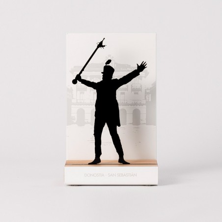 Figure souvenir avec structure en acier laqué en blanc, base en bois de chêne et silhouette avec le motif “Tambour-major” (personnage de la Tamborrada de San Sebastián) découpé au laser sur du méthacrylate noir brillant avec une épaisseur de 3mm.