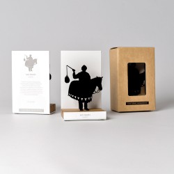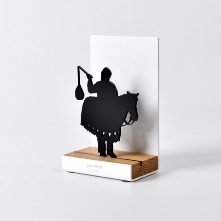 Figure souvenir avec structure en acier laqué en blanc, base en bois de chêne et silhouette avec le motif Zaldiko découpé au laser sur du méthacrylate noir brillant avec une épaisseur de 3mm.